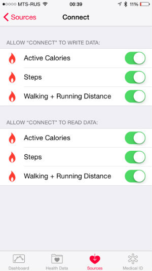 Во-вторых, iOS-приложение Garmin Connect позволяет обмениваться данными с приложением «Здоровье» (Apple Health). Для этого надо запустить «Здоровье», нажать на «Источники» (Sources), и там мы увидим Connect. Кликнув на Connect, мы увидим, какими данными приложение может делиться и какие данные — получать от Apple Health.