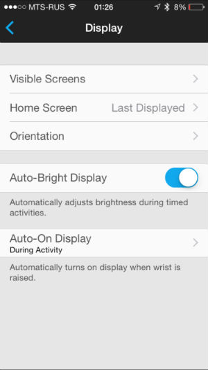 Перейдем к настройкам устройства. Жмем Devices / Settings / Device Settings (да, вот такая громоздкость!) и видим там строчку Display. Она-то нам и нужна. Как мы уже упоминали в первой части статьи (но подробно не раскрывали этот момент), браслет оснащен экраном, на который может выводиться разная информация: как та, что касается фитнес-функций, так и уведомления со смартфона. Максимальное количество экранов (то есть типов выводимой информации) — 11.