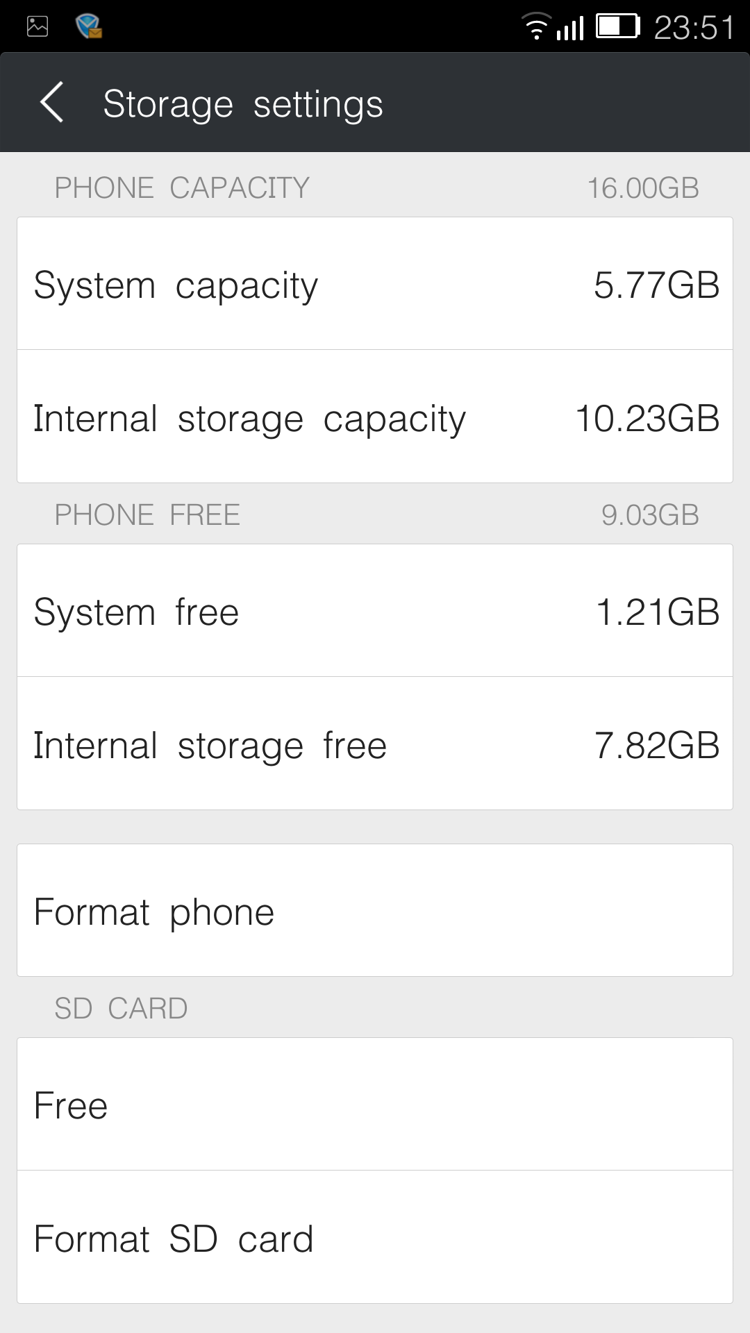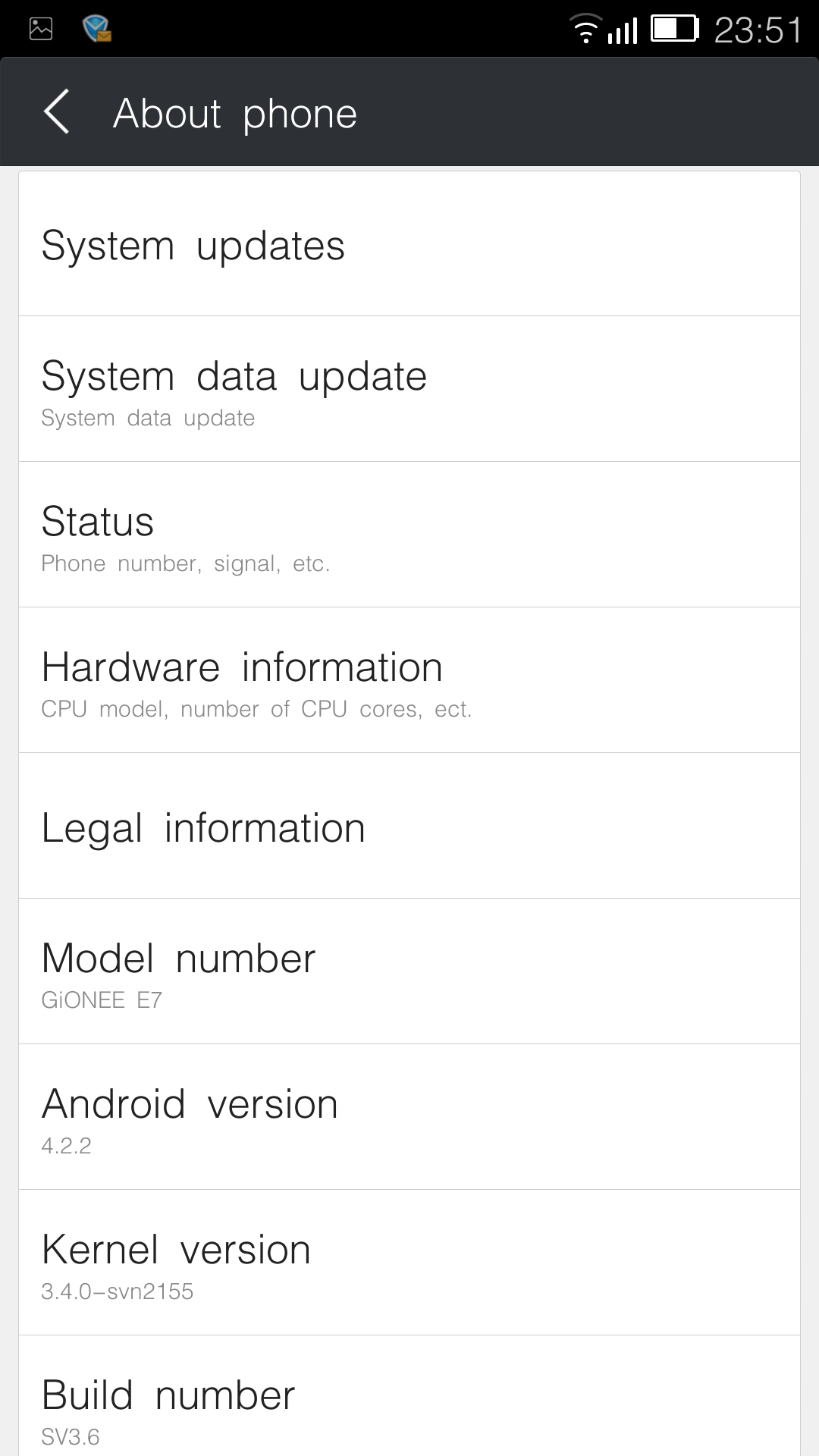 Судя по всему, операционная система в Gionee Elife E7 собрана из исходников Android и имеет собственное название — Amigo либо Gionee GN 4.2.5 (в разных местах указаны различные имена). Обновление прошивки производится автоматически, но скорость загрузки с китайских серверов очень низкая.