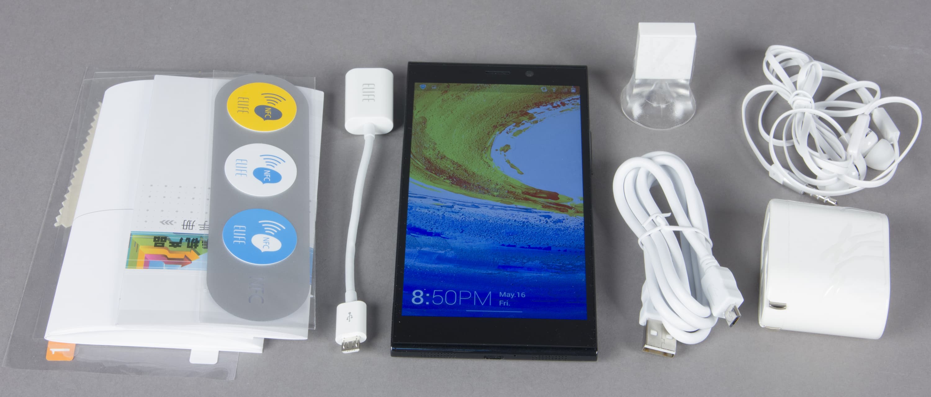 Внутри коробки находятся: смартфон, зарядное устройство (щелевой/американский стандарт вилки) с USB-совместимым разъемом, проводная стереогарнитура, кабель Micro-USB—USB, кабель USB OTG (USB-host), набор меток NFC, защитная пленка на экран с салфеткой, документация, пластиковый параллелепипед на присоске непонятного назначения (вероятно, еще одна NFC метка), iСкрепка для извлечения лотка для SIM-карты. Будь в этом списке еще какой-нибудь чехол и док-станция, и набор аксессуаров стал бы максимальным. Но и в своем нынешнем виде комплектация Gionee Elife E7 заслуживает похвалы.