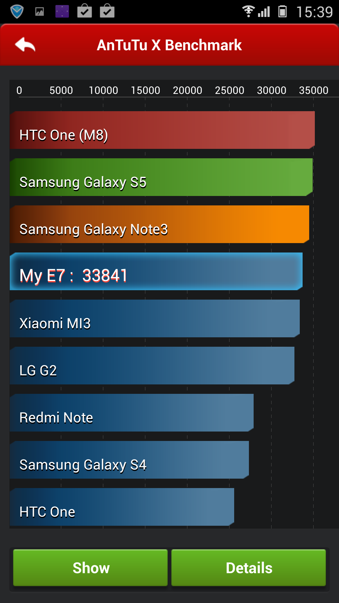 | Gionee Elife E7 (Snapdragon 800) | HTC One (M8) (Snapdragon 801) | Samsung Galaxy S5 (Snapdragon 801) | LG G2 (Snapdragon 800) | TCL Idol X+ (MediaTek MT6592) | Lenovo Vibe Z (Snapdragon 800) | |