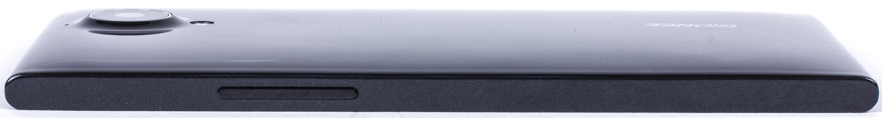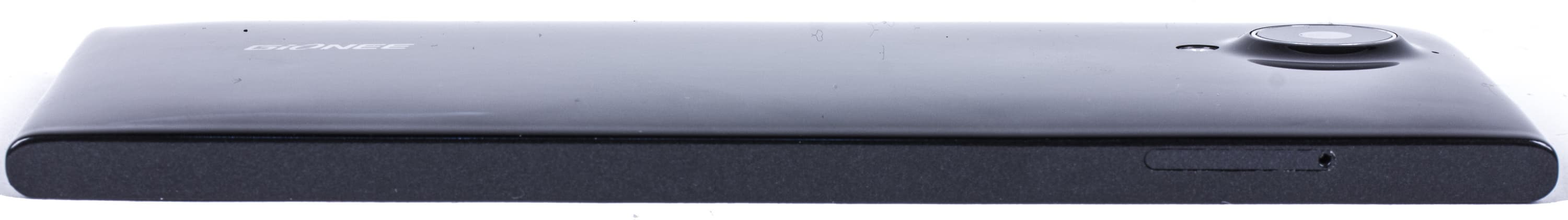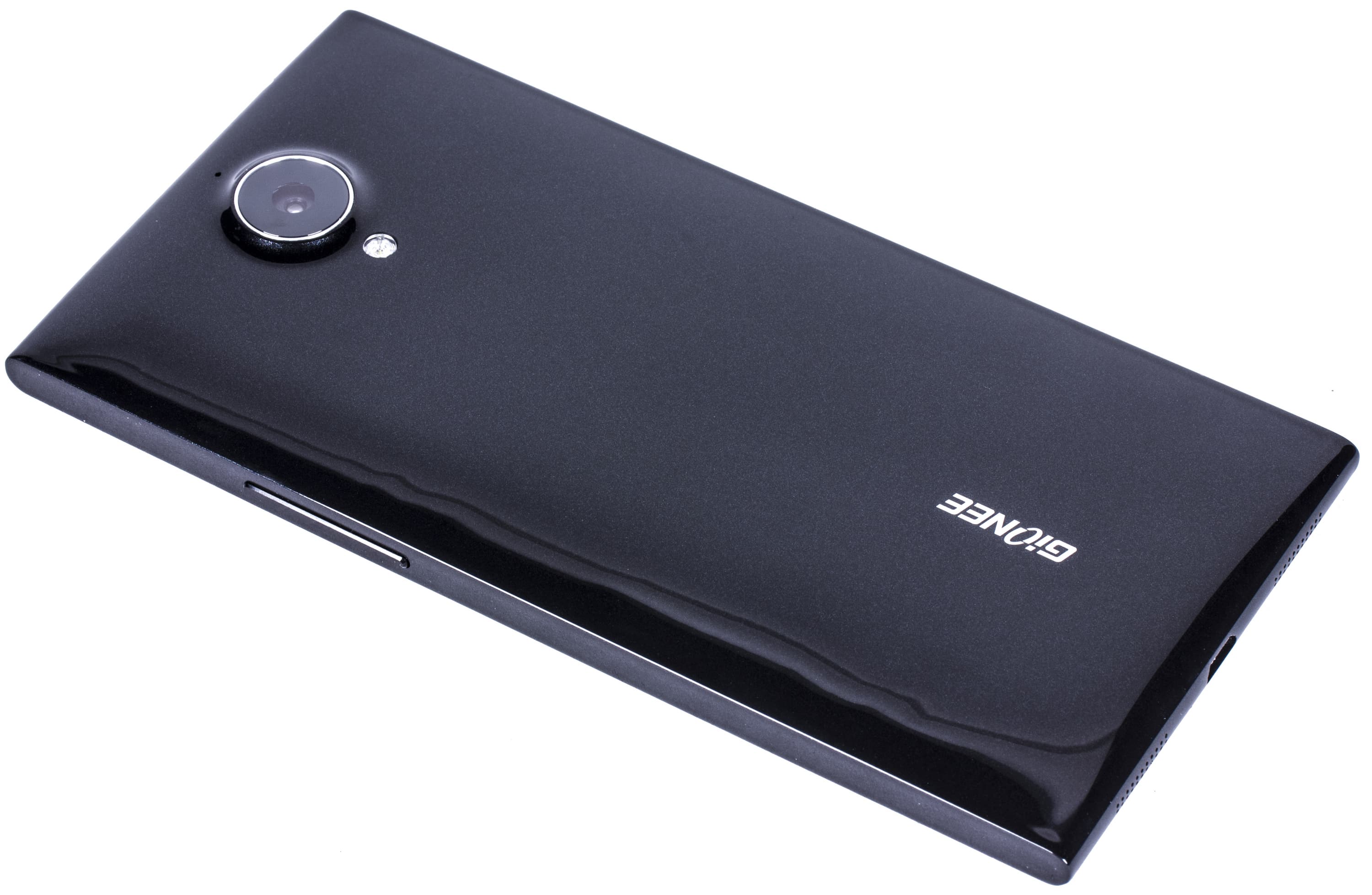 Глянцевый пластик быстро покрывается отпечатками пальцев, также быстро ими покрывается объектив камеры. Рядом с последним находится светодиодная вспышка и дополнительный микрофон. Название компании-производителя приведено в нижней части панели продольно основной оси корпуса. Тем самым Gionee лишний раз подчеркивает «фотоориентированность» своего флагманского смартфона.