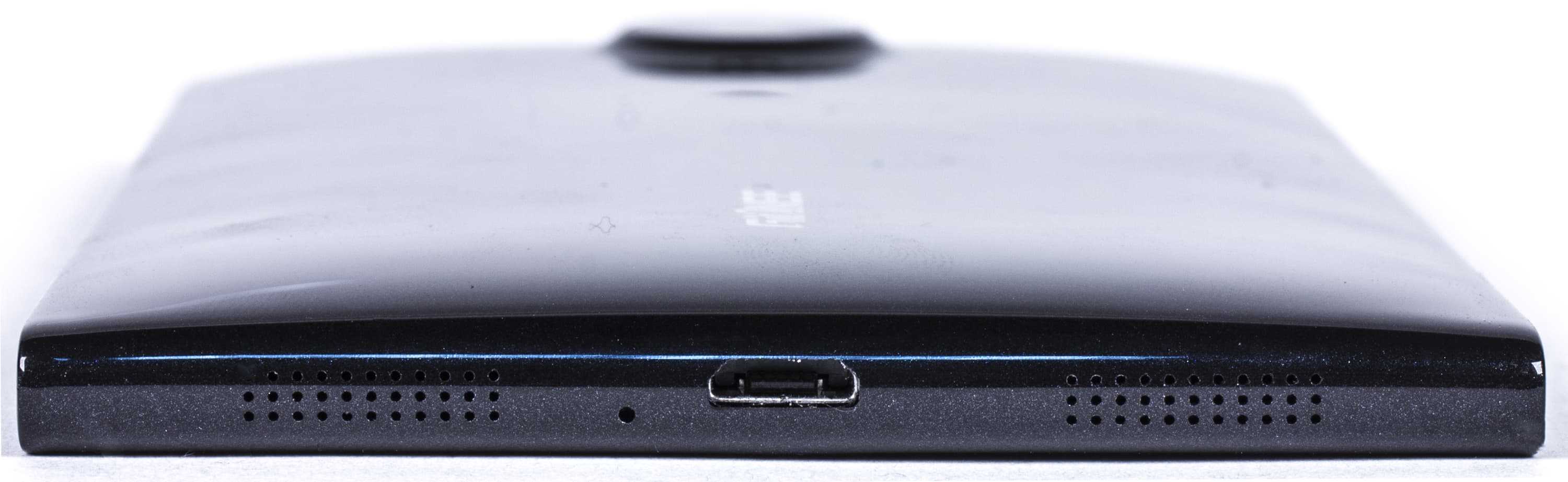 На нижнем скругленном торце можно обнаружить разъем Micro-USB, микрофон и динамик смартфона. Динамик расположен справа от разъема, там же, где и микрофон. Слева от разъема сделаны декоративные отверстия для красоты и симметрии.