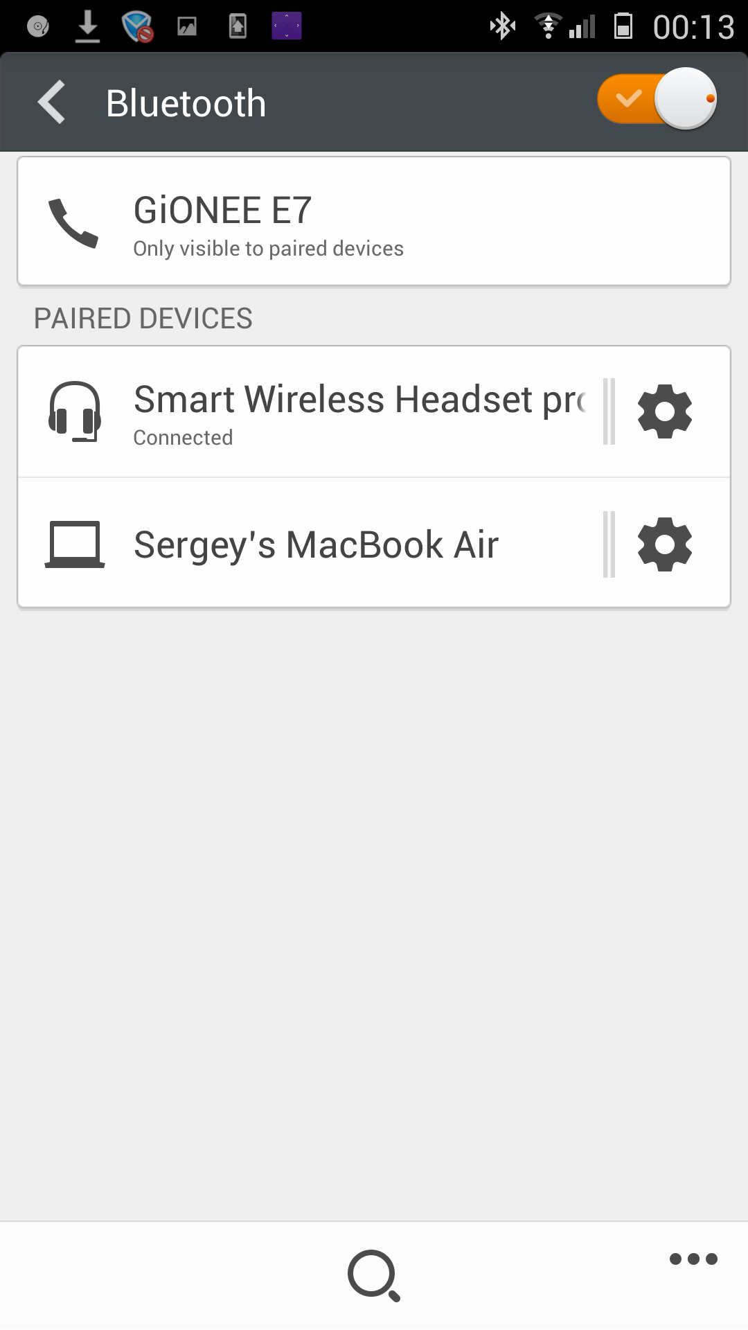 Работа модуля Bluetooth не вызвала нареканий, несколько удивило лишь отсутствие возможности подключить смартфон в качестве модема. Gionee Elife E7 успешно соединился с беспроводной гарнитурой Sony MW1 и ноутбуком MacBook Air. В первом случае, используя связку двух устройств, стало возможно прослушивать музыку и совершать телефонные вызовы. Во втором случае — обмениваться файлами и исследовать содержимое памяти смартфона. Скорость обмена информацией составила 1,6 Мбит/с.