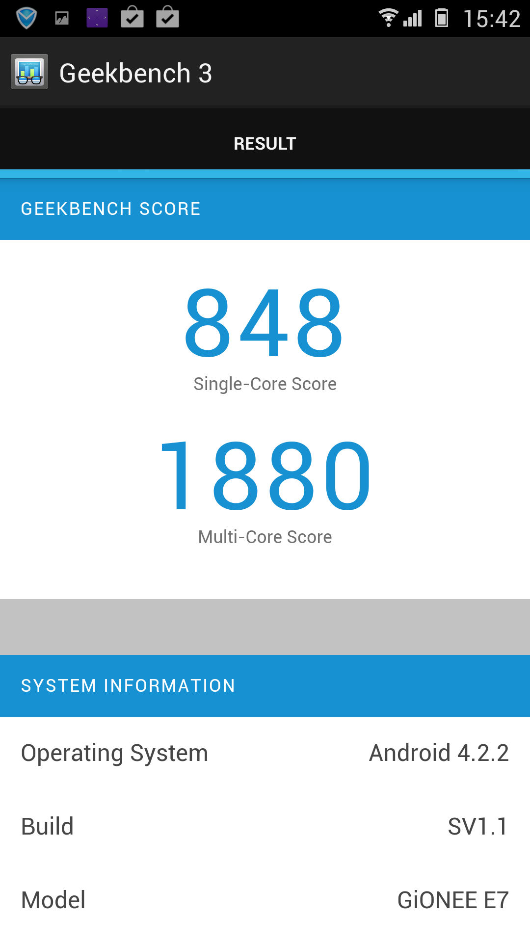 В тесте AnTuTu герой обзора занял полагающееся ему место, лишь немного уступив Lenovo Vibe Z с аналогичным процессором. В тесте MobileXPRT 2013 китайский флагман смог пройти только тесты производительности, в тестах на быстродействие интерфейса программа зависала — вероятно, по причине отсутствия в прошивке Gionee Elife E7 некоторых стандартных API Google.