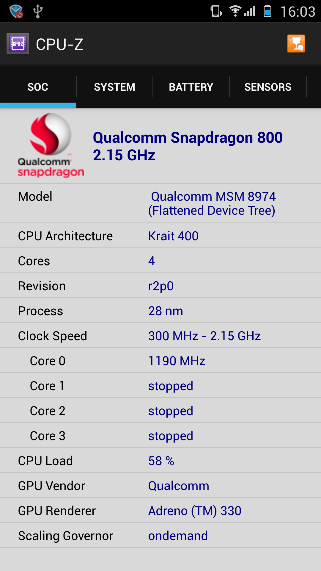 - SoC Qualcomm Snapdragon 800 (MSM8974), 4 ядра Krait 400, 2,2 ГГц