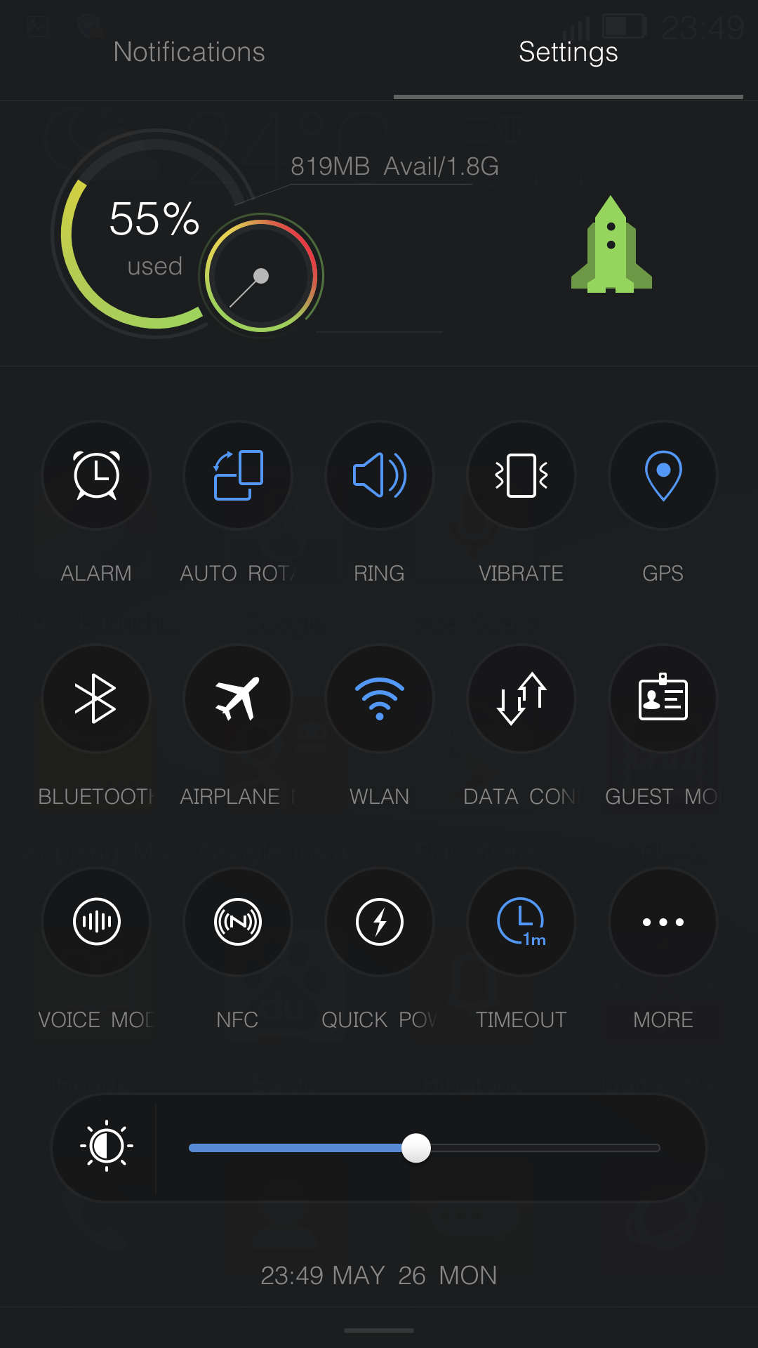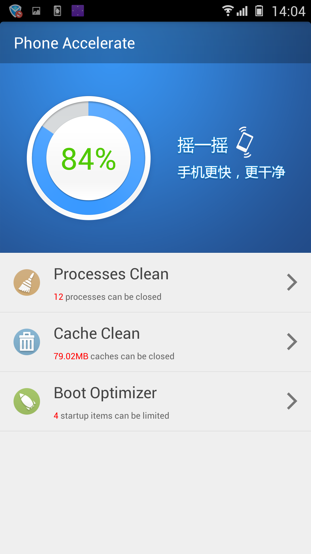 Четвертое приложение, Phone Accelerate, занимается очисткой оперативной памяти от ненужных программ, очисткой кэша операционной системы и настройкой списка загружаемых автоматически с ОС приложений.