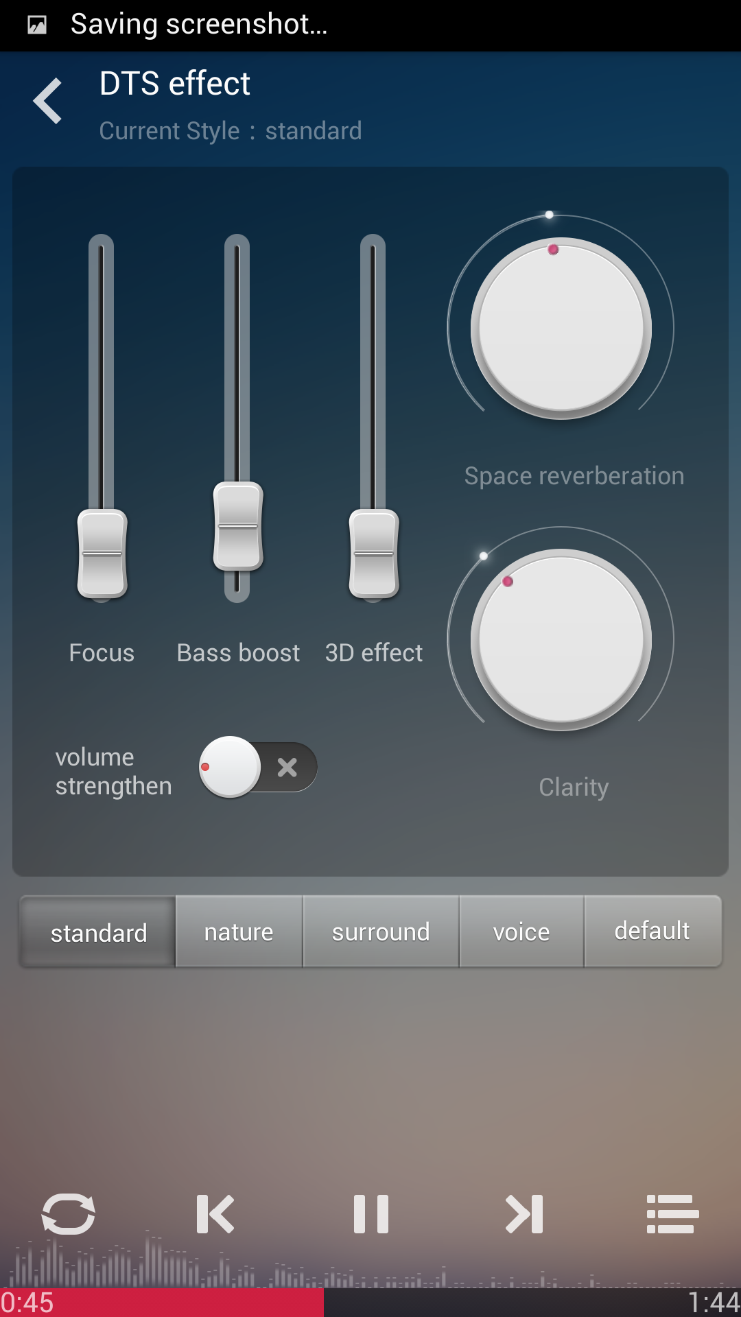 В настройках штатного плеера присутствует вкладка с названием DTS effect. В некотором роде она заменяет эквалайзер: можно усилить нижние и верхние частоты, добавить эффект 3D и реверберацию. Есть несколько преднастроенных разработчиками режимов обработки звука. Пользоваться этой системой или нет — решать владельцу, это вопрос вкуса.