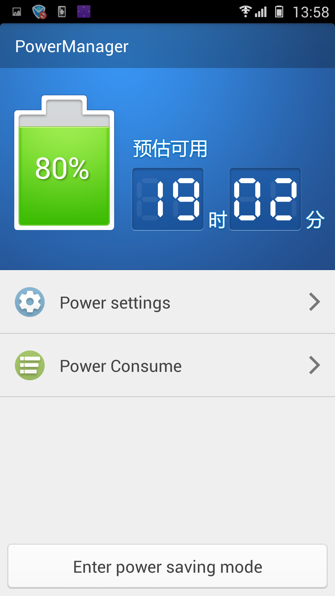 Третье приложение, PowerManager, выдает информацию о потреблении энергии различными приложениями и компонентами смартфона. Там же можно настроить режим энергосбережения и активировать его.