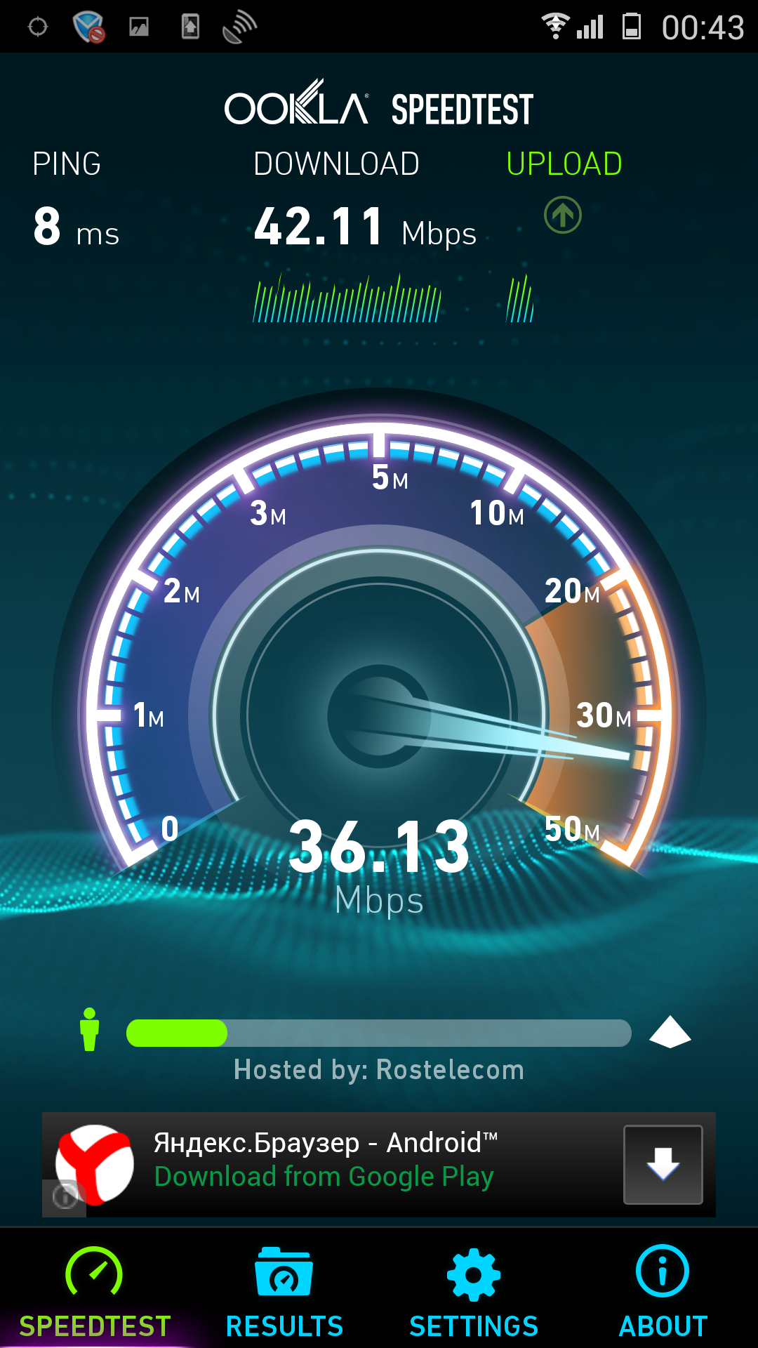Возможности модуля Wi-Fi точно нигде не указаны, но исходя из параметров аналогичных смартфонов, в Gionee Elife E7 должны быть реализованы стандарты IEEE 802.11b/g/n/ac. Роутера с поддержкой 802.11ac под рукой не оказалось, но в связке с TP-Link TL-WR1043ND в сети 802.11n герой обзора продемонстрировал неплохой результат. В Gionee Elife E7 также поддерживается создание точки доступа Wi-Fi и технология Wi-Fi Direct.