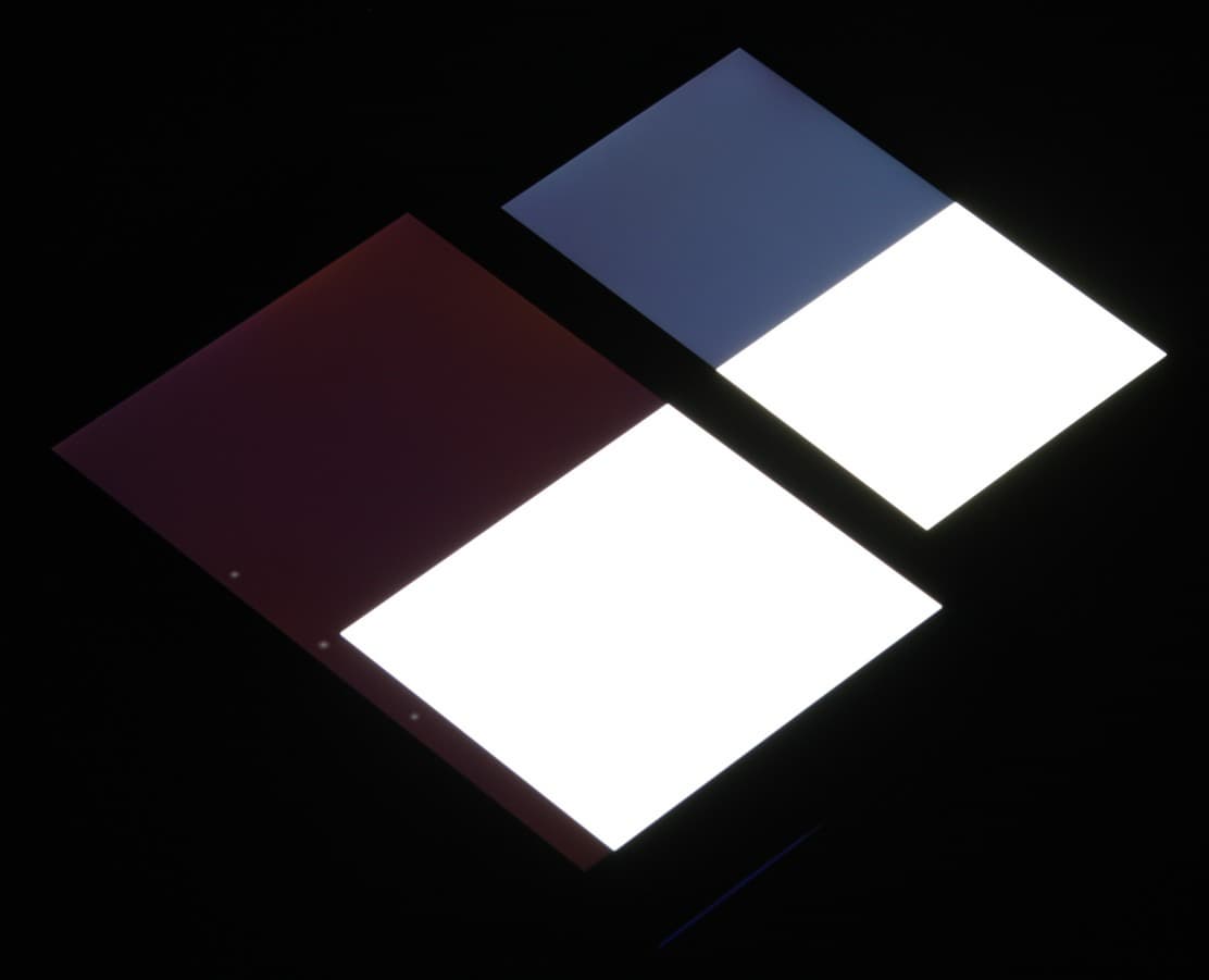 Яркость под углом у экранов уменьшилась (как минимум в 4 раза, исходя из разницы в выдержке), но у Gionee Elife E7 экран все же светлее (яркость по фотографиям 232 против 219 у Nexus 7). Черное поле при отклонении по диагонали высветляется сильно и приобретает фиолетовый оттенок или остается почти нейтрально-серым. Фотографии ниже это демонстрируют (яркость белых участков в перпендикулярном плоскости экранов направлении одинаковая!):