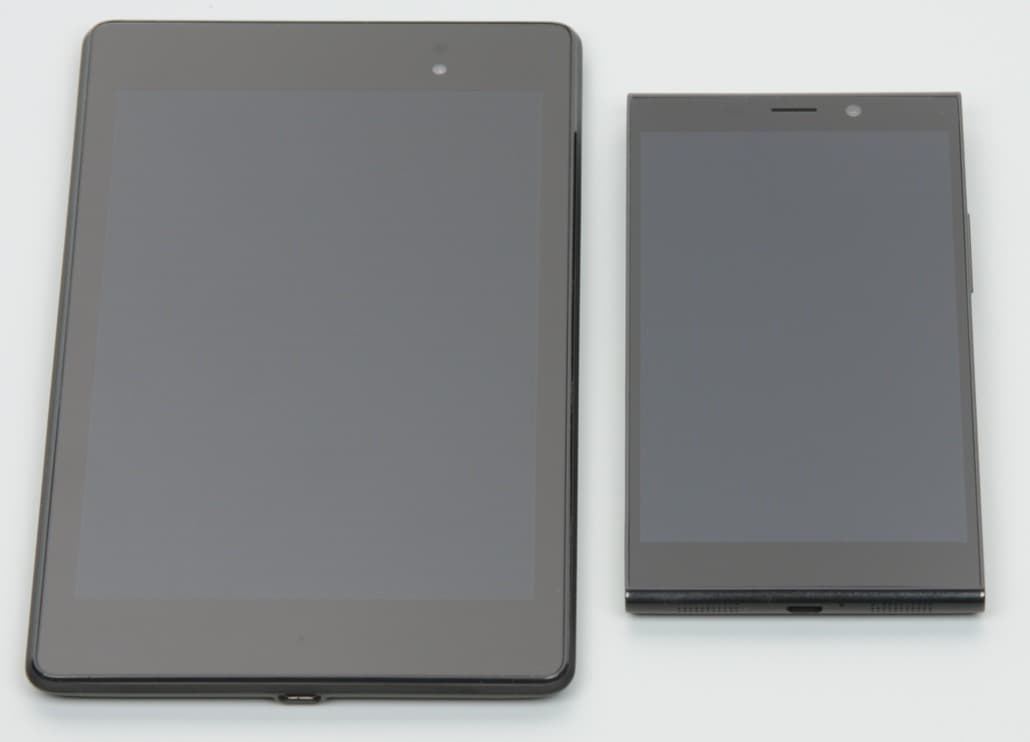 Лицевая поверхность экрана выполнена в виде стеклянной пластины с зеркально-гладкой поверхностью, устойчивой к появлению царапин. Судя по отражению объектов, антибликовые свойства экрана не хуже, чем у экрана Google Nexus 7 (2013) (далее просто Nexus 7). Для наглядности приведем фотографию, на которой в выключенных экранах отражается белая поверхность (слева — Nexus 7, справа — Gionee Elife E7, далее их можно различать по размеру):