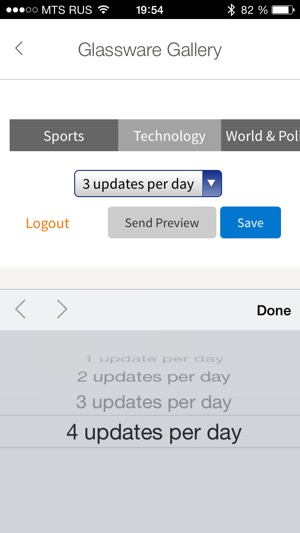 При установке приложения вы указываете интересующие вас темы, а также количество обновлений за день (от одного до четырех). После этого вы получаете на свои очки новые материалы, которые можете прослушать (поддерживается только английский язык) или прочитать.