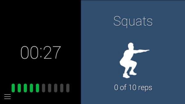 Например, первое упражнение: 10 приседаний. Вы видите секундомер, начинаете приседать, а голос тренера отсчитывает приседания и комментирует ваши действия.