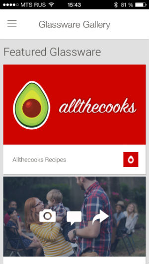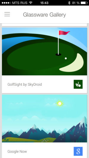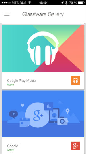 Идем дальше. Active Glassware — это те приложения, которые установлены в ваших очках. А, соответственно, Glassware Gallery — это каталог приложений. На момент написания статьи их было немногим более полусотни. Это все основные сервисы Google (Gmail, Google+, Hangouts, Google Play Music и т.д.), Facebook, Twitter, Evernote, Tumblr, Path и другие (преимущественно, известные) проекты.