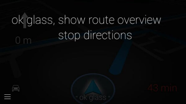 Стартовый экран показывает время и сообщает основную голосовую команду, с которой начинается любое взаимодействие с очками: ok glass. Произнеся ее, мы попадем в меню, где можно выбрать одно из действий: запустить Google Now, снять фото, снять видео, проложить маршрут, послать сообщение или совершить звонок.