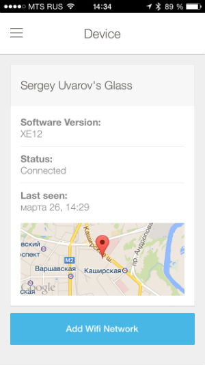 Давайте посмотрим, что представляет собой интерфейс приложения. Чтобы увидеть меню приложения, надо кликнуть по значку в левом верхнем углу или провести пальцем от левой границы экрана. Первый пункт меню — Device. Он же открыт по умолчанию. Здесь мы видим название устройства, номер модели, статус соединения со смартфоном (подключен или нет), время и место (на карте) последнего соединения. Внизу пункт Add WiFi Network. Он нужен для того, чтобы подсоединить очки к Wi-Fi сети.