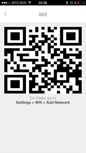 Это делается следующим образом. Нажимаем на Add Wifi Network, выбираем доступную Wi-Fi сеть и видим QR-код. Далее надо в меню очков пройти в Settings / WiFi / Add Network и навести взгляд на QR-код на смартфоне.