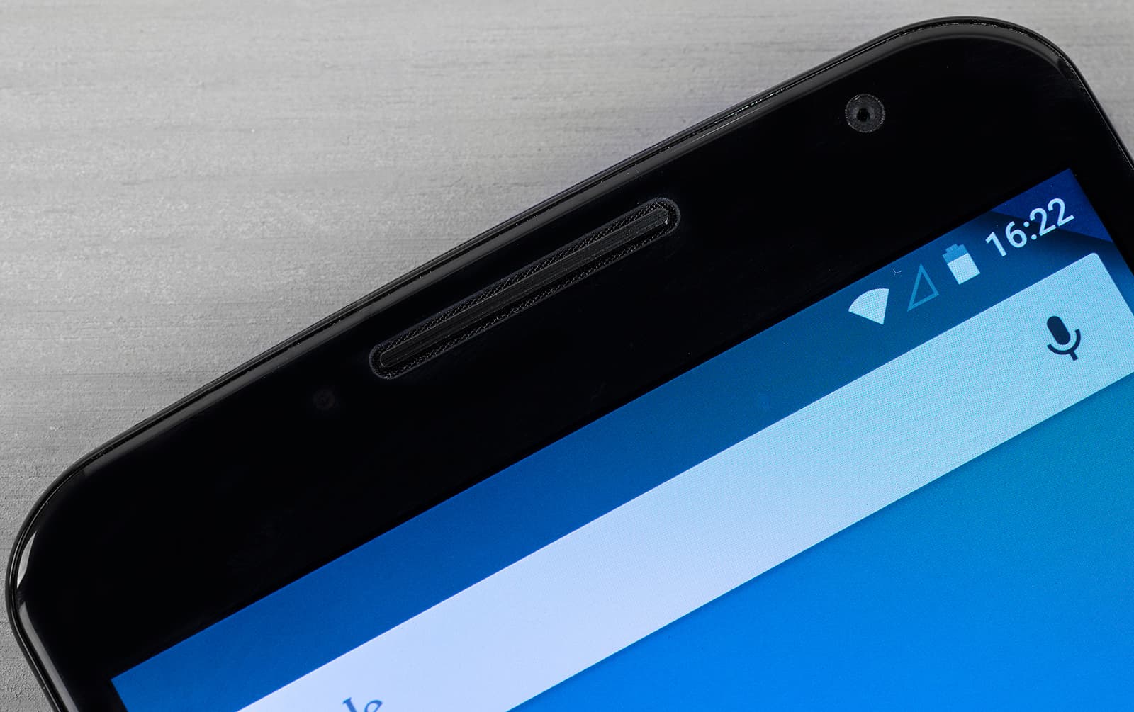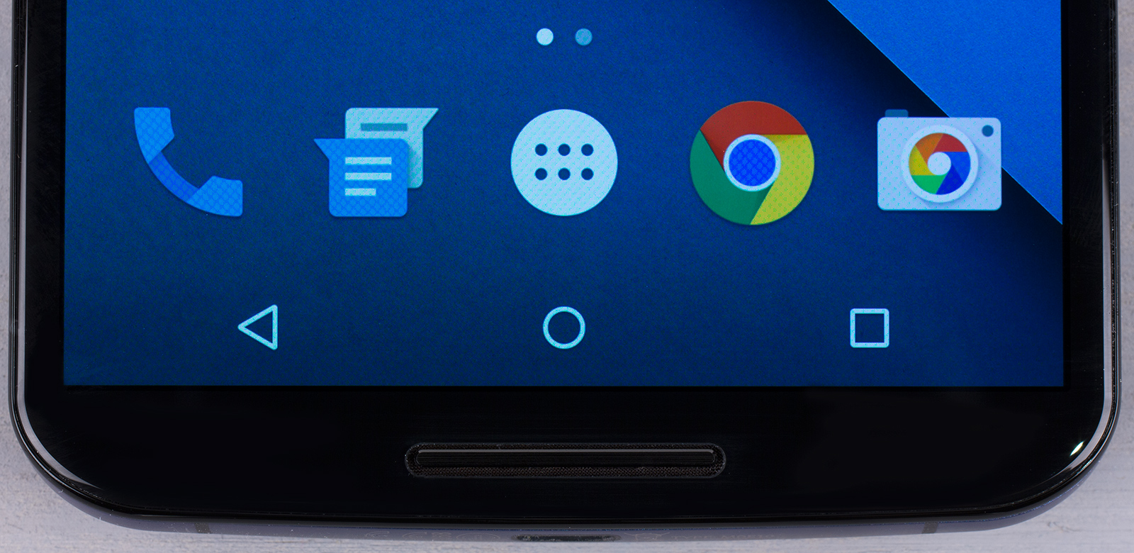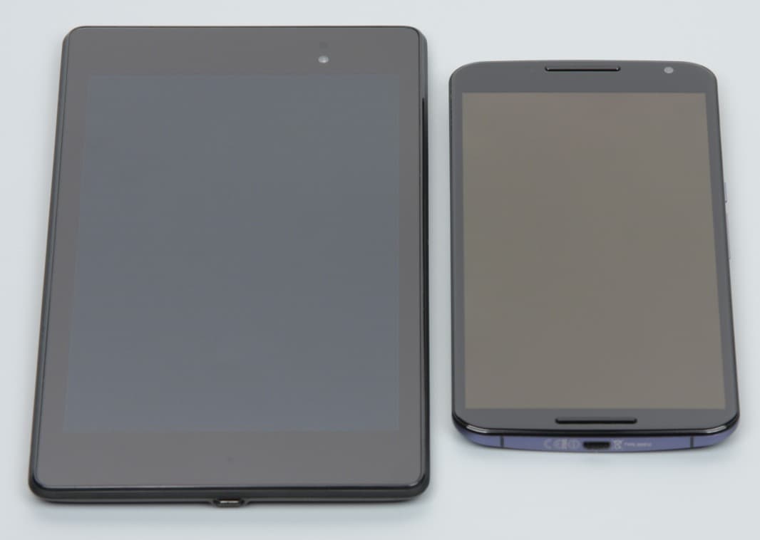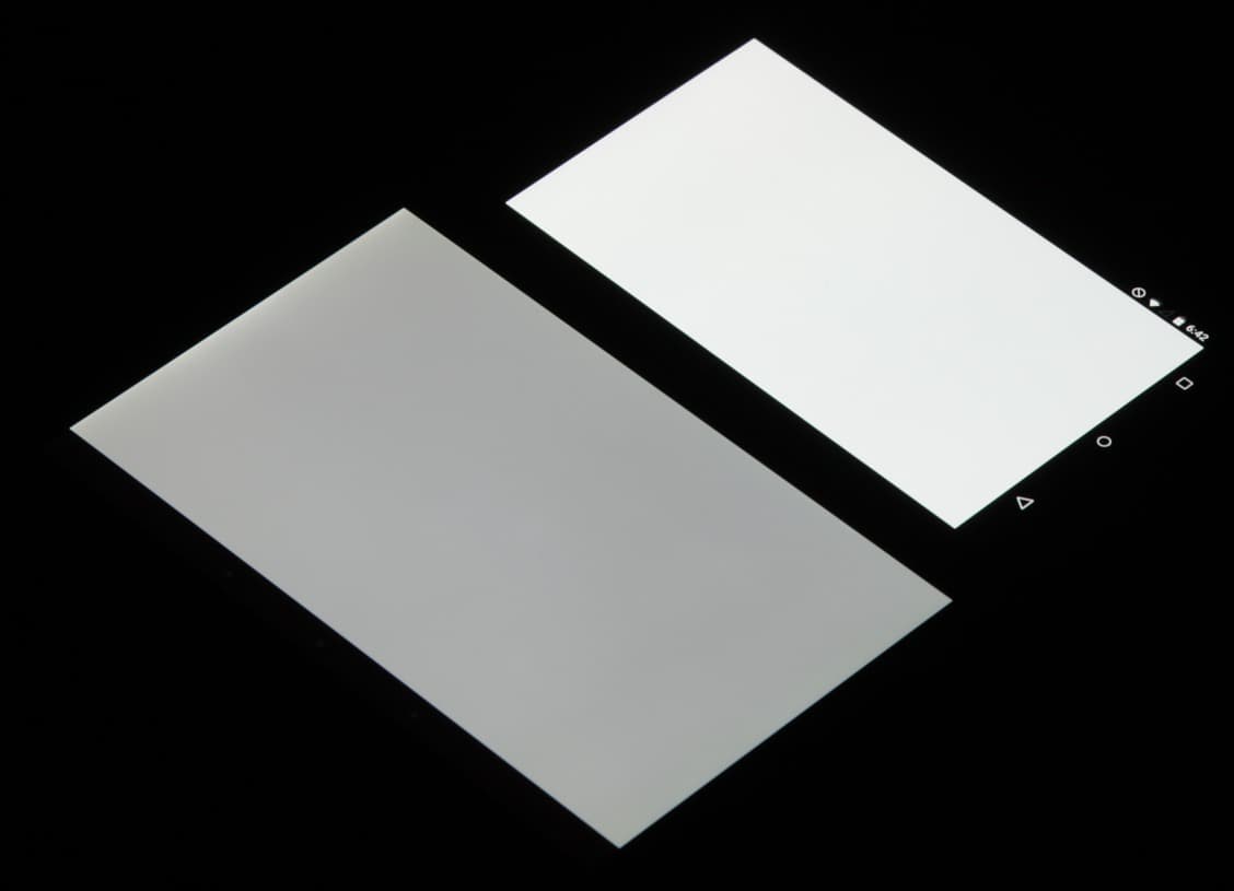 Лицевая поверхность экрана выполнена в виде стеклянной пластины с зеркально-гладкой поверхностью, устойчивой к появлению царапин. Судя по отражению объектов, антибликовые свойства экрана сравнимы со свойствами экрана Google Nexus 7 (2013) (далее просто Nexus 7). Для наглядности приведем фотографию, на которой в выключенных экранах отражается белая поверхность (слева — Nexus 7, справа — Nexus 6, далее их можно различать по размеру):