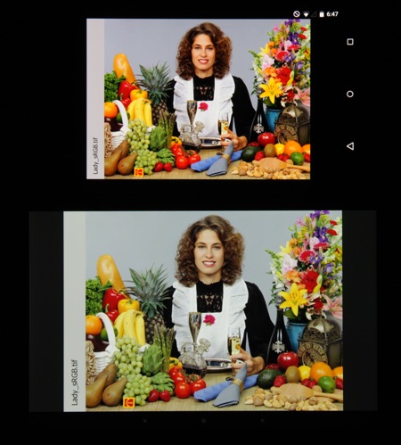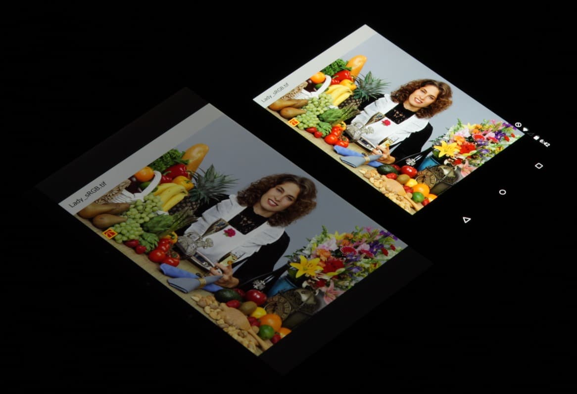 Яркость под углом у обоих экранов заметно уменьшилась (чтобы избежать сильного затемнения, выдержка увеличена в сравнении с предыдущими двумя фотографиями), но в случае Nexus 6 падение яркости выражено гораздо меньше. В итоге при формально одинаковой яркости экран Nexus 6 визуально выглядит гораздо более ярким (в сравнении с ЖК-экранами), так как на экран мобильного устройства часто приходится смотреть как минимум под небольшим углом. И тестовая картинка: