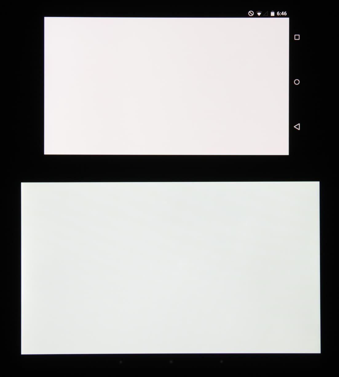 Экран характеризуется великолепными углами обзора, и хотя белый цвет при отклонении даже на небольшие углы приобретает легкий сине-зеленый оттенок, а под некоторыми углами слегка розовеет, но черный цвет — просто черный под любыми углами. Он настолько черный, что параметр контрастности в данном случае просто неприменим. При перпендикулярном взгляде равномерность белого поля хорошая. Для сравнения приведем фотографии, на которых на экраны Nexus 6 и второго участника сравнения выведены одинаковые изображения, при этом яркость экранов изначально установлена примерно на 200 кд/м², а цветовой баланс на фотоаппарате принудительно переключен на 6500 К. Белое поле:
