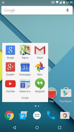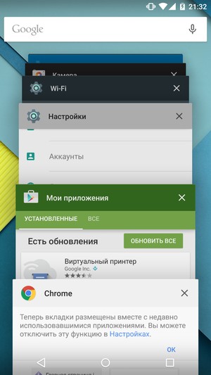 В Lollipop система уведомлений была существенно переработана и расширена. Уведомления вышли за пределы собственной панели на передний план и стали отображаться теперь даже поверх запущенных приложений в виде этаких карточек, каждая из которых интерактивна и кликабельна. Панель быстрого доступа к наиболее важным функциям, совмещенная с панелью уведомлений, теперь стала телескопически раскладываться в два этапа. Также можно отметить появление энергосберегающего режима, которого раньше в «голом» Android просто не существовало, и возможность создания пользовательских профилей — проще говоря, гостевого режима, при котором можно передавать устройство другому человеку без страха за сохранность собственных секретов. Что касается предустановленных программ, то их здесь традиционно нет совсем, имеется лишь набор фирменных приложений самой Google, и больше ничего. Нет даже элементарного файлового менеджера — все необходимо докачивать и доустанавливать из онлайн-магазина Play Store.