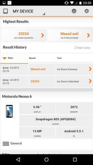По результатам тестирования в бенчмарках смартфон продемонстрировал высочайший на сегодняшний день уровень производительности, практически рекордный: по данным AnTuTu Nexus 6 обогнал лидировавших до него Meizu MX4 и Samsung Galaxy Note 4, встав на высшую ступень пьедестала над всеми имеющимся на текущий момент в розничной продаже смартфонами на ОС Android. Впрочем, победителем Nexus 6 будет оставаться совсем недолго: последние сводки с выставки MWC 2015 выявляют все новые рекорды. Согласно полученной нами из тестов информации, платформа Samsung Exynos 7420, на которой работает корейская новинка Galaxy S6 Edge, выдала в AnTuTu более высокие результаты (65К баллов, а в 64-битном режиме — так и все 70К), на фоне которых мощь Snapdragon 805 (50К баллов) немного меркнет.