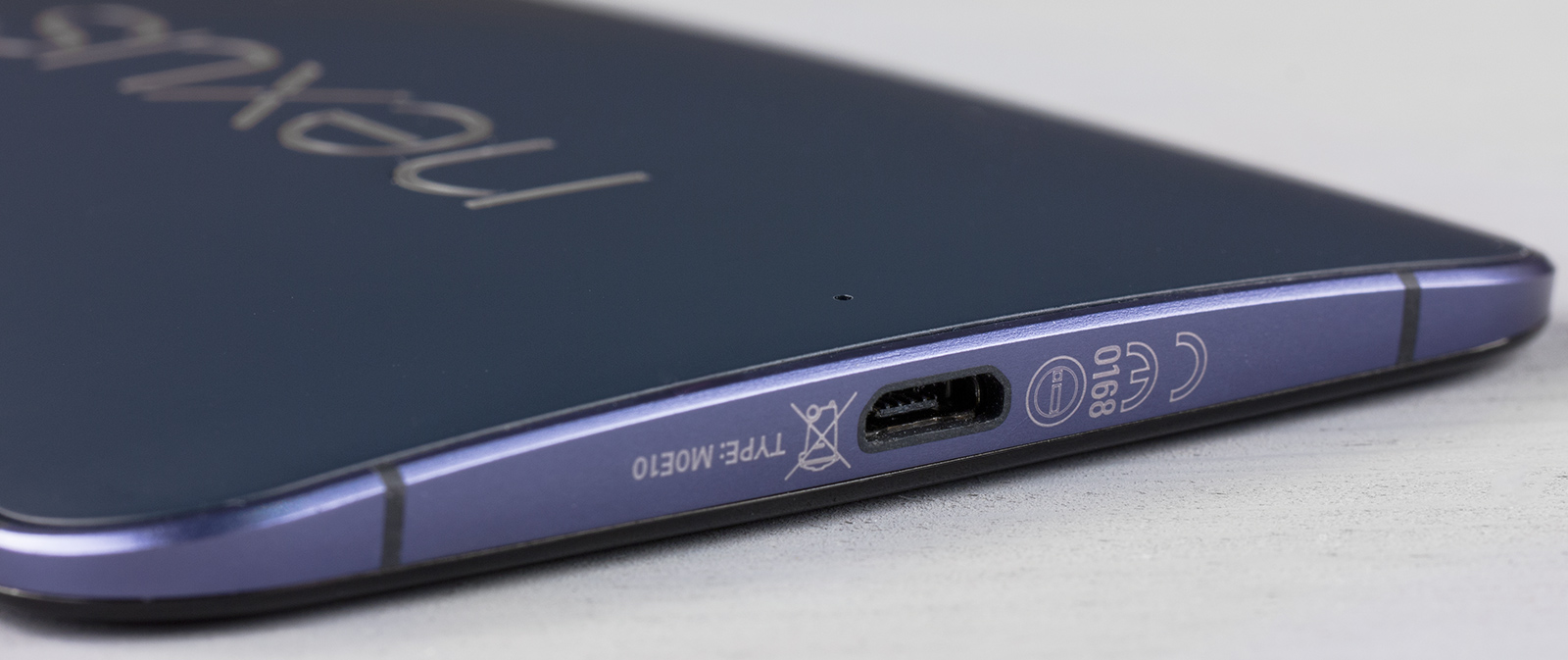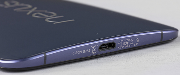 Слот для SIM-карты располагается на этот раз не cбоку, а в верхнем торце, прямо рядом с выходом на наушники (3,5 мм). Разъем Micro-USB врезан в нижний торец. Никакими заглушками выходы и разъемы у Nexus 6 не прикрыты, хотя на фирменном сайте упоминается наличие защиты смартфона от воды. Но это, скорее всего, лишь защита от капель и брызг, а полностью погружать аппарат в воду не стоит — во всяком случае, соответствие конкретным стандартам защиты для данного смартфона не заявлено.