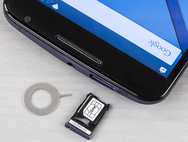 Корпус Nexus 6 монолитный, задняя крышка несъемная, SIM-карта привычно въезжает в слот на салазках и извлекается с помощью ключика-скрепки. Салазки, кстати, выглядят необычно: у них имеется некий прижимной механизм. SIM-карта здесь используется формата Nano-SIM, карточку аппарат поддерживает лишь одну, и для карты памяти тоже традиционно места не нашлось. Поскольку подключение внешних флэш-накопителей к порту USB аппарат в штатном режиме тоже не поддерживает, то пользователю остается раз и навсегда выбрать для себя подходящий объем памяти (32 или 64 ГБ) — ведь больше никакими средствами он в дальнейшем увеличен быть не сможет. Впрочем, если получить root-права и поставить утилиту StickMount, то режим USB OTG будет работать.