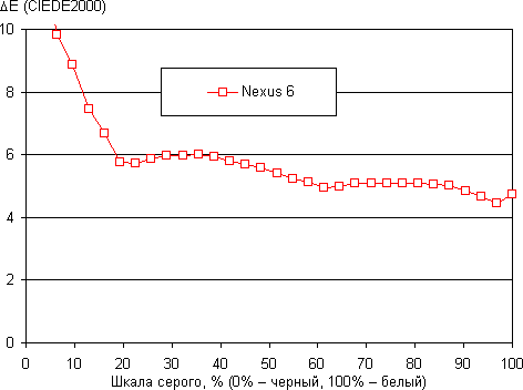 Напомним, что в случае OLED-экранов яркость фрагментов изображения динамично меняется в соответствии с характером выводимого изображения — уменьшается для светлых в целом изображений и увеличивается для темных. В итоге полученная зависимость яркости от оттенка (гамма-кривая), скорее всего, немного не соответствует гамма-кривой статичного изображения, так как измерения проводились при последовательном выводе оттенков серого почти на весь экран. На приведенном выше графике зависимости яркости от времени при переходе от черного к белому и обратно есть ниспадающий участок, то есть яркость белого поля после примерно 0,3 с начинает уменьшаться. Это доказывает, что в данном экране постоянно включена дополнительная подстройка яркости, которую в случае готовых изделий от Samsung можно отключить. Компания Motorola или по собственной инициативе лишила пользователя права выбора, или ей запретил это делать поставщик экрана — компания Samsung. Аналогичные спекуляции можно провести и для возможности выбора профиля, в частности аппаратного уменьшения цветового охвата: у планшетов/смартфонов Samsung профили в настройках экрана есть, у Nexus 6 и большинства смартфонов не Samsung с экранами AMOLED — нет. В итоге цветовой охват у Nexus 6 очень широкий: