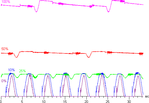Только на очень низком уровне яркости присутствует значимая модуляция с частотой 236,5 Гц. На рисунке ниже приведены зависимости яркости (вертикальная ось) от времени (горизонтальная ось) для нескольких значений яркости:
