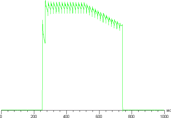 Переключение состояния элементов матрицы выполняется практически мгновенно, но на фронте включения может присутствовать ступенька шириной примерно 17 мс (что соответствует частоте обновления экрана). Например, так выглядит зависимость яркости от времени при переходе от черного к белому при выводе поля во весь экран: