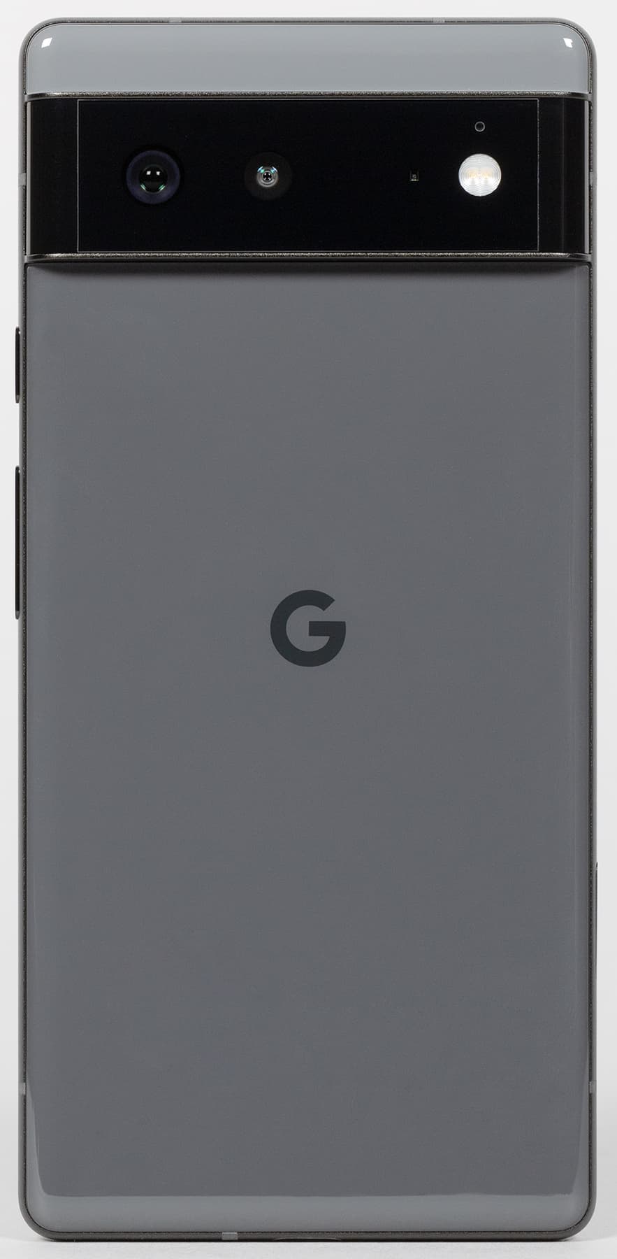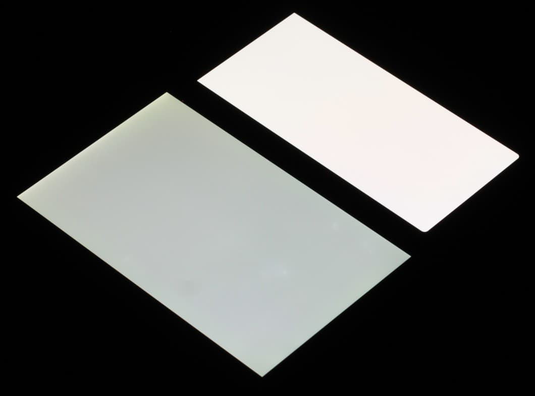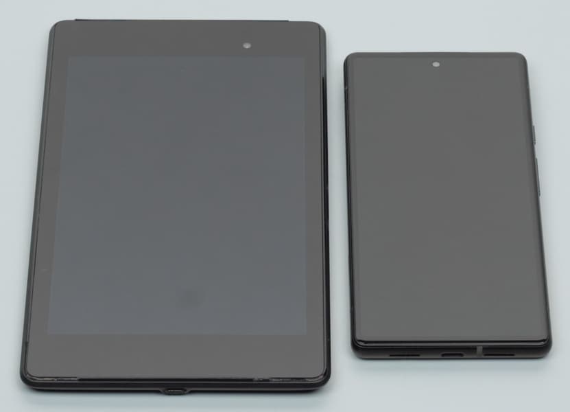 Лицевая поверхность экрана выполнена в виде стеклянной пластины с зеркально-гладкой поверхностью, устойчивой к появлению царапин. Судя по отражению объектов, антибликовые свойства экрана не хуже, чем у экрана Google Nexus 7 (2013) (ниже просто Nexus 7). Для наглядности приведем фотографию, на которой в выключенных экранах отражается белая поверхность (слева — Nexus 7, справа — Google Pixel 6, далее их можно различать по размеру):