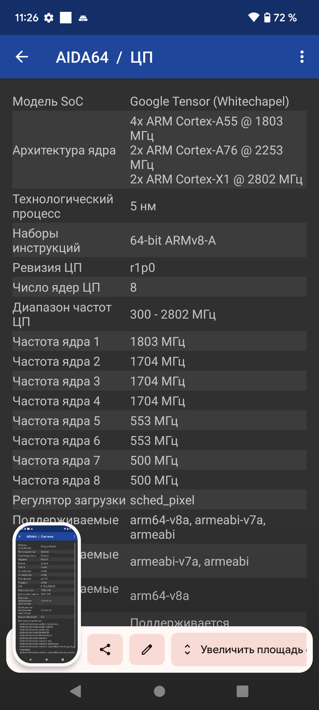 - SoC Google Tensor, 8 процессорных ядер (2×Cortex-X1 @2,80 ГГц + 2×Cortex-A76 @2,25 ГГц + 4×Cortex-A55 @1,80 ГГц)