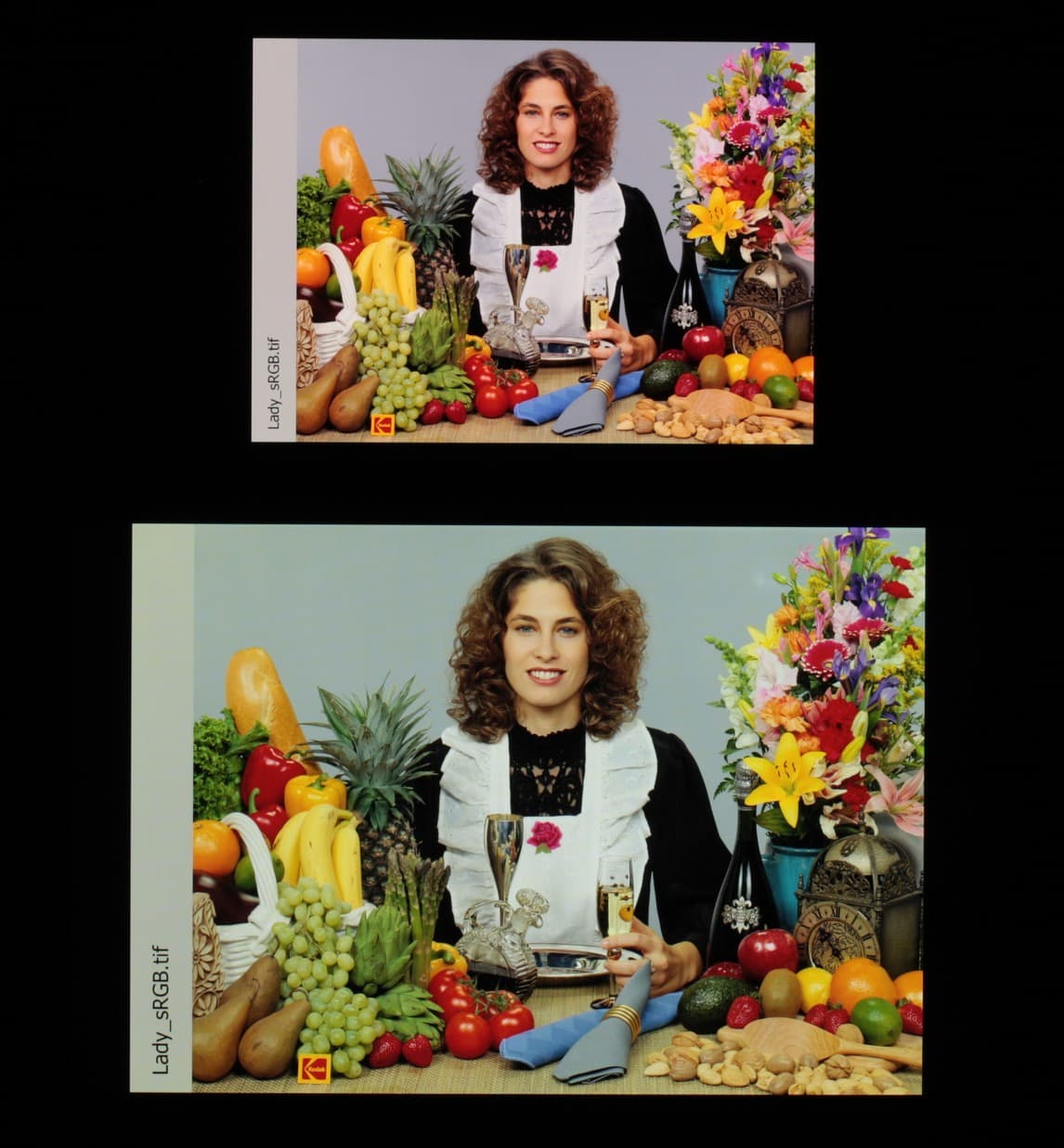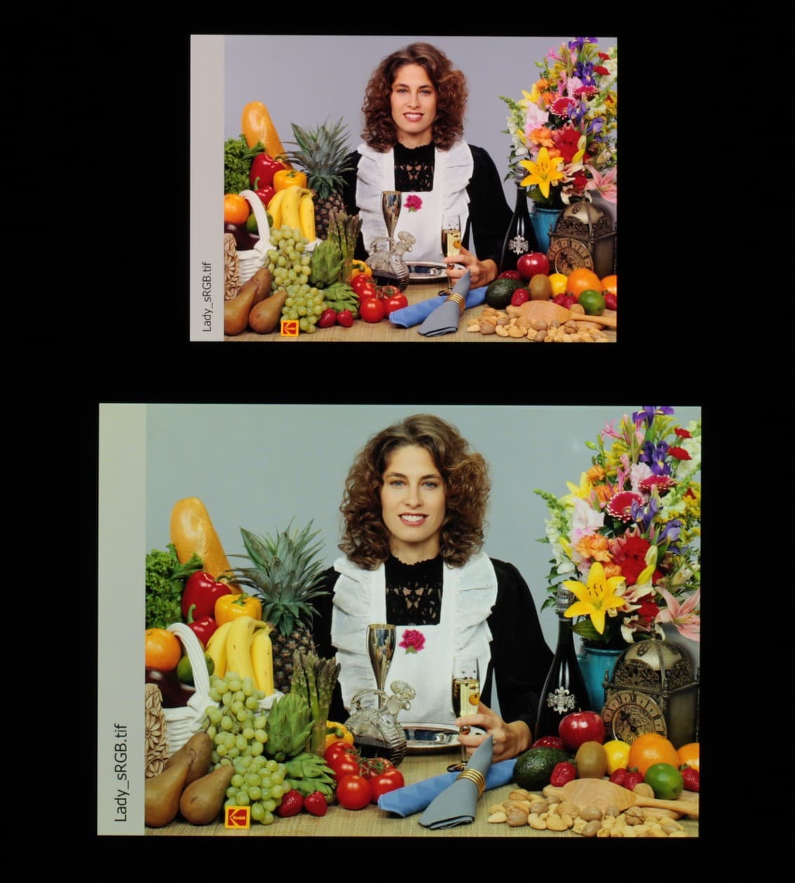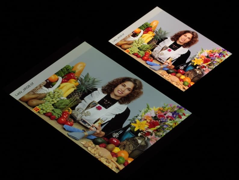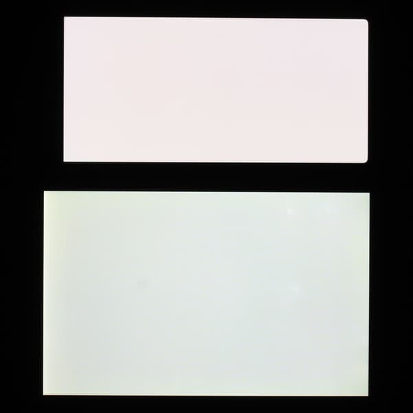 Согласно визуальной оценке, цвета у тестируемого экрана более-менее естественные, а цветовой баланс экранов немного различается. Напомним, что фотография не может служить надежным источником сведений о качестве цветопередачи и приводится только для условной наглядной иллюстрации. В частности, выраженный красноватый оттенок белого и серого полей, присутствующий на фотографиях тестируемого экрана, при перпендикулярном взгляде визуально отсутствует, что подтверждается аппаратными тестами с помощью спектрофотометра. Причина в том, что спектральная чувствительность матрицы фотоаппарата неточно совпадает с этой характеристикой человеческого зрения.