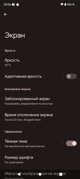 При ручном управлении яркостью и при выводе белого поля во весь экран максимальное значение яркости составило примерно 470 кд/м², а на очень ярком свету и в случае автоматической регулировки оно может повышаться до 770 кд/м². Также нужно учитывать, что для этого типа экрана чем меньше площадь белого на экране, тем он светлее, то есть фактическая максимальная яркость белых участков будет почти всегда выше указанных значений, а темная тема не только экономит заряд аккумулятора, но способствует лучшей разборчивости информации на экране в условиях высокой освещенности. В итоге, учитывая отличные антибликовые свойства, читаемость днем на солнце, должна быть на хорошем уровне. Минимальное значение яркости — 2 кд/м², то есть пониженный уровень яркости без проблем позволяет использовать устройство даже в полной темноте. Есть автоматическая регулировка яркости по датчику освещенности (он расположен под экраном близко к верхнему краю и примерно по центру горизонтально). В автоматическом режиме при изменении внешних условий освещенности яркость экрана как повышается, так и понижается. Работа этой функции зависит от положения ползунка регулировки яркости: им пользователь может попытаться выставить желаемый уровень яркости в текущих условиях. В условиях освещенного искусственным светом офиса (примерно 550 лк) мы установили яркость на 120 кд/м², при этом в полной темноте функция автояркости уменьшает яркость до 10 кд/м² (сойдет), а условно под прямыми лучами солнца повышает до 770 кд/м² (до максимума). Результат нас удовлетворил, но для эксперимента мы попробовали понизить яркость в полной темноте, получив в итоге для трех условий, указанных выше, следующие значения: 3, 100 и 770 кд/м² (в темноте снизилась сильно, в «офисе» — незначительно). Получается, что функция автоподстройки яркости работает адекватно и позволяет пользователю настраивать свою работу под индивидуальные требования.