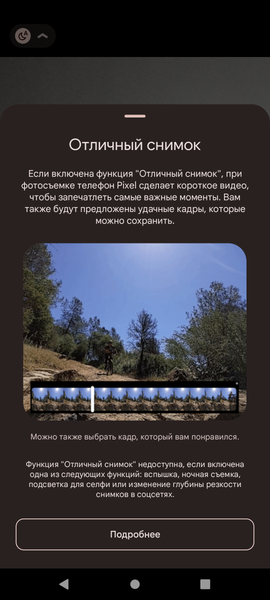Доступен мгновенный запуск съемки по двойному нажатию клавиши питания даже при выключенном экране. Интерфейс управления своеобразный (но такой родной для всех, кто уже много лет ставит на свои смартфоны неофициальные версии Google Camera!). Видно, что разработчики постарались сделать его максимально наглядным и интуитивно понятным. Есть интересные режимы, например «Отличный снимок», который предлагает на выбор наиболее удачные кадры из сделанной с очень короткими интервалами серии снимков, или эксклюзивный режим «Движение», в котором фон вокруг объекта сильно размазывается, будто бы на длинной экспозиции, хотя сам объект остается при этом максимально четким, и наоборот. Можно даже удалять лишние объекты с фото без использования сторонних программ.