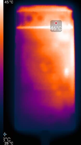 Нагрев больше в верхней левой части аппарата, что, видимо, соответствует расположению микросхемы SoC. По данным теплокамеры, максимальный нагрев составил 46 градусов (при температуре окружающего воздуха в 24 градуса), это существенно выше среднего значения в данном тесте для современных смартфонов.
