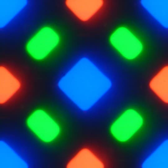 В этом экране используется матрица AMOLED — активная матрица на органических светодиодах. Полноцветное изображение создается с помощью субпикселей трех цветов — красного (R), зеленого (G) и синего (B), но красных и синих субпикселей в два раза меньше, что можно обозначить как RGBG. Это подтверждается фрагментом микрофотографии: