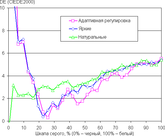 (Самые темные области шкалы серого в большинстве случаев можно не учитывать, так как там баланс цветов не имеет большого значения, да и погрешность измерений цветовых характеристик на низкой яркости большая.)