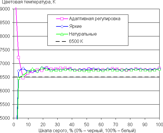 В случае всех трех профилей баланс оттенков на шкале серого хороший, так как цветовая температура близка к стандартным 6500 К, а отклонение от спектра абсолютно черного тела (ΔE) ниже 10 единиц, что для потребительского устройства считается приемлемым показателем. При этом цветовая температура и ΔE мало изменяются от оттенка к оттенку — это положительно сказывается на визуальной оценке цветового баланса: