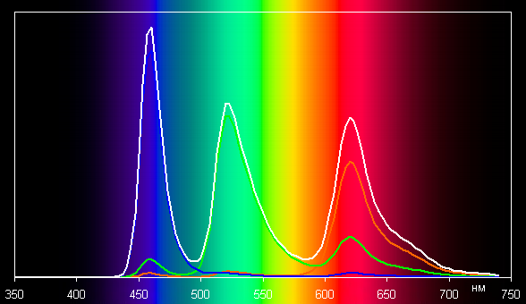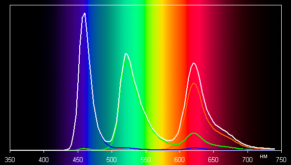 Без коррекции (вариант Яркие) спектры компонент (то есть спектры чистых красного, зеленого и синего цветов) хорошо разделены, но какое-то перекрестное подмешивание все же есть: