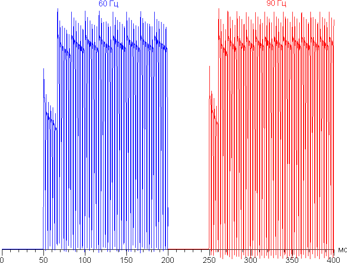 В режиме 90 Гц плавность прокрутки списков меню заметно повышается. Посмотрим, изменится ли при этом характер модуляции: