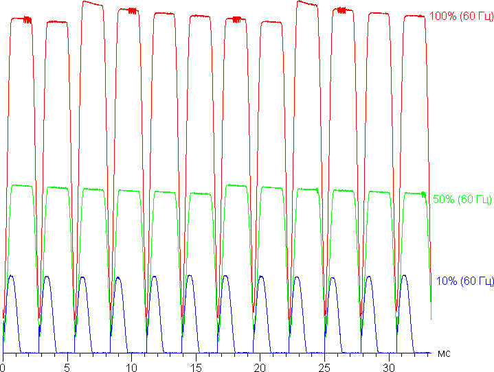 На любом уровне яркости присутствует значимая модуляция с частотой 360 Гц. На рисунке ниже приведены зависимости яркости (вертикальная ось) от времени (горизонтальная ось) для нескольких значений настройки яркости. Сначала для режима с частотой обновления 60 Гц: