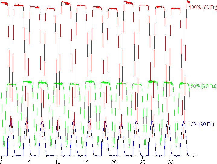 Видно, что на высокой и средней яркости амплитуда модуляции довольно большая, но скважность низкая, в итоге видимого мерцания нет. Однако при сильном понижении яркости появляется модуляция с большой относительной амплитудой и высокой скважностью, ее наличие уже можно увидеть в тесте на присутствие стробоскопического эффекта или просто при быстром движении глаз. В зависимости от индивидуальной чувствительности такое мерцание может вызывать повышенную утомляемость. Впрочем, фаза модуляции различается по площади экрана, а частота довольно высокая, поэтому негативный эффект от мерцания снижен.