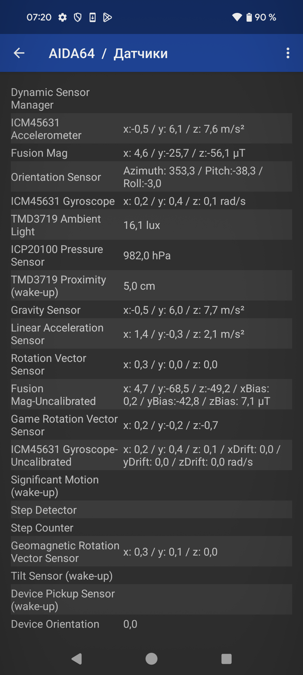 Голос собеседника в динамике разборчивый, громкость высокая. Вибромотор приятный, хорошо ощутимый. Все необходимые встроенные датчики, вплоть до гироскопа, на месте. Набор максимален: есть даже встроенные барометр с термометром.
