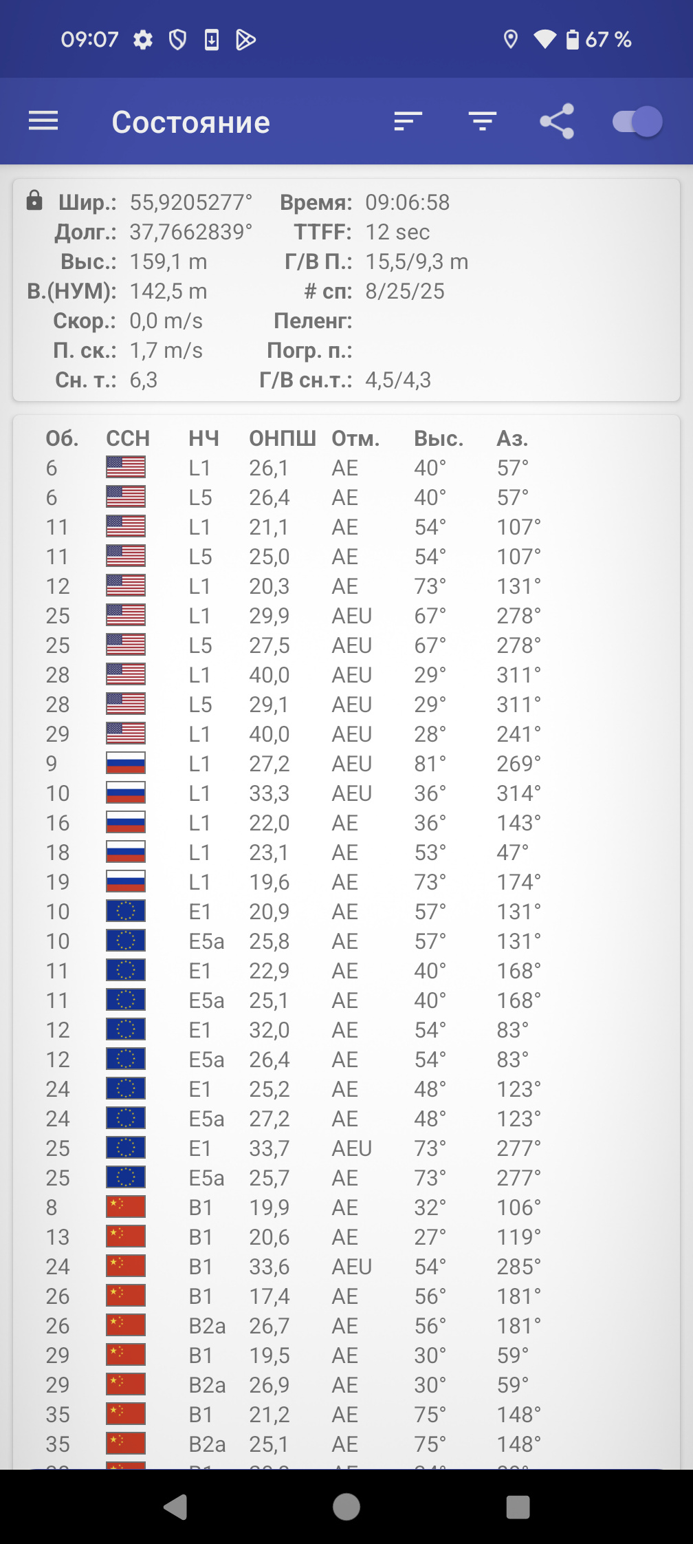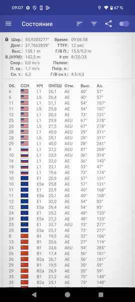- GPS (L1+L5), Глонасс (G1), Galileo (E1+E5a), QZSS (L1+L5)