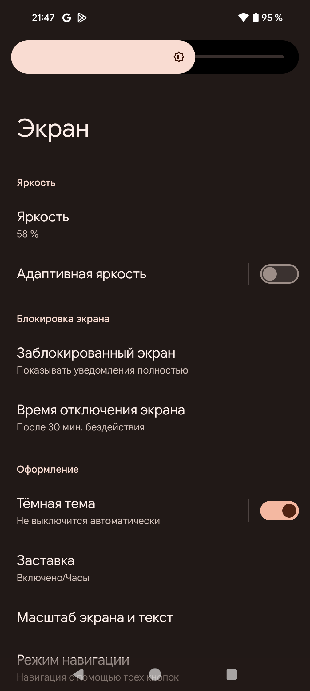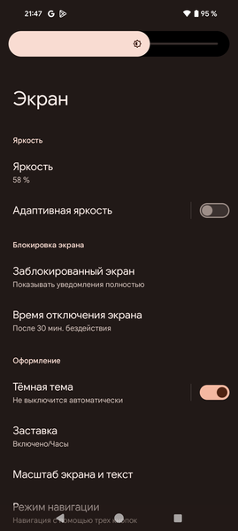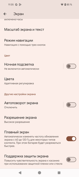 Подведем итоги. Экран имеет очень высокую максимальную яркость (до 1500 кд/м²) и обладает отличными антибликовыми свойствами, поэтому устройством без особых проблем можно пользоваться вне помещения даже летним солнечным днем. В полной темноте яркость можно понизить до комфортного значения (вплоть до 1,9 кд/м²). Допустимо использовать режим с автоматической подстройкой яркости, работающий адекватно. К достоинствам экрана также нужно отнести эффективное олеофобное покрытие, повышенное разрешение, поддержку цветового охвата sRGB и DCI-P3 (при участии ПО Google Photos), очень хороший цветовой баланс и динамическую подстройку частоты обновления до 120 Гц. Заодно напомним про общие достоинства OLED-экранов: истинный черный цвет (если в экране ничего не отражается), заметно меньшее, чем у ЖК, падение яркости изображения при взгляде под углом. К недостаткам можно отнести мерцание экрана, при желании обнаруживаемое визуально на низкой яркости. У пользователей, особо чувствительных к мерцанию, из-за этого может возникать повышенная утомляемость. Тем не менее, в целом качество экрана очень высокое.