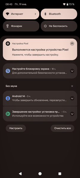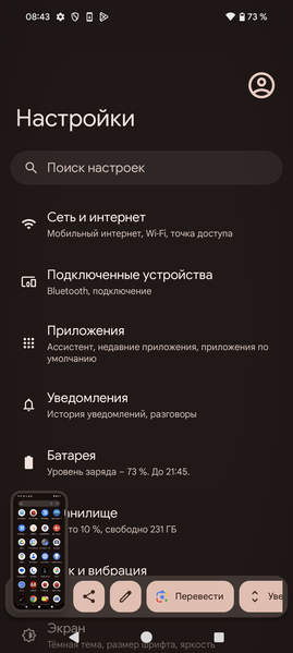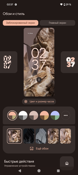 Интерфейс хорошо оптимизированный, работает плавно и быстро. Все необходимые возможности для самостоятельной настройки имеются, можно использовать жесты или вывести для управления три классические кнопки внизу. В «чистой» версии Android шторка не разделена на две части в зависимости от места оттягивания, она единая телескопическая. В новой версии добавили еще больше возможностей для кастомизации внешнего вида: виджеты и обои можно буквально программировать вручную, они будут реагировать на время суток и погоду, меняясь и подстраиваясь. Очень много внимания уделено работе функций на основе ИИ, но в текущих реалиях на территории России от них толку мало.