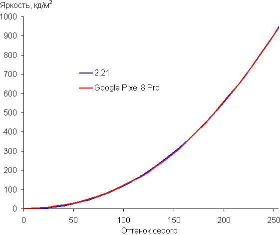 Напомним, что в случае OLED-экранов яркость фрагментов изображения динамично меняется в соответствии с характером выводимого изображения — чуть уменьшается для светлых в целом изображений. В итоге полученная зависимость яркости от оттенка (гамма-кривая), скорее всего, не соответствует гамма-кривой статичного изображения, так как измерения проводились при последовательном выводе оттенков серого почти на весь экран.